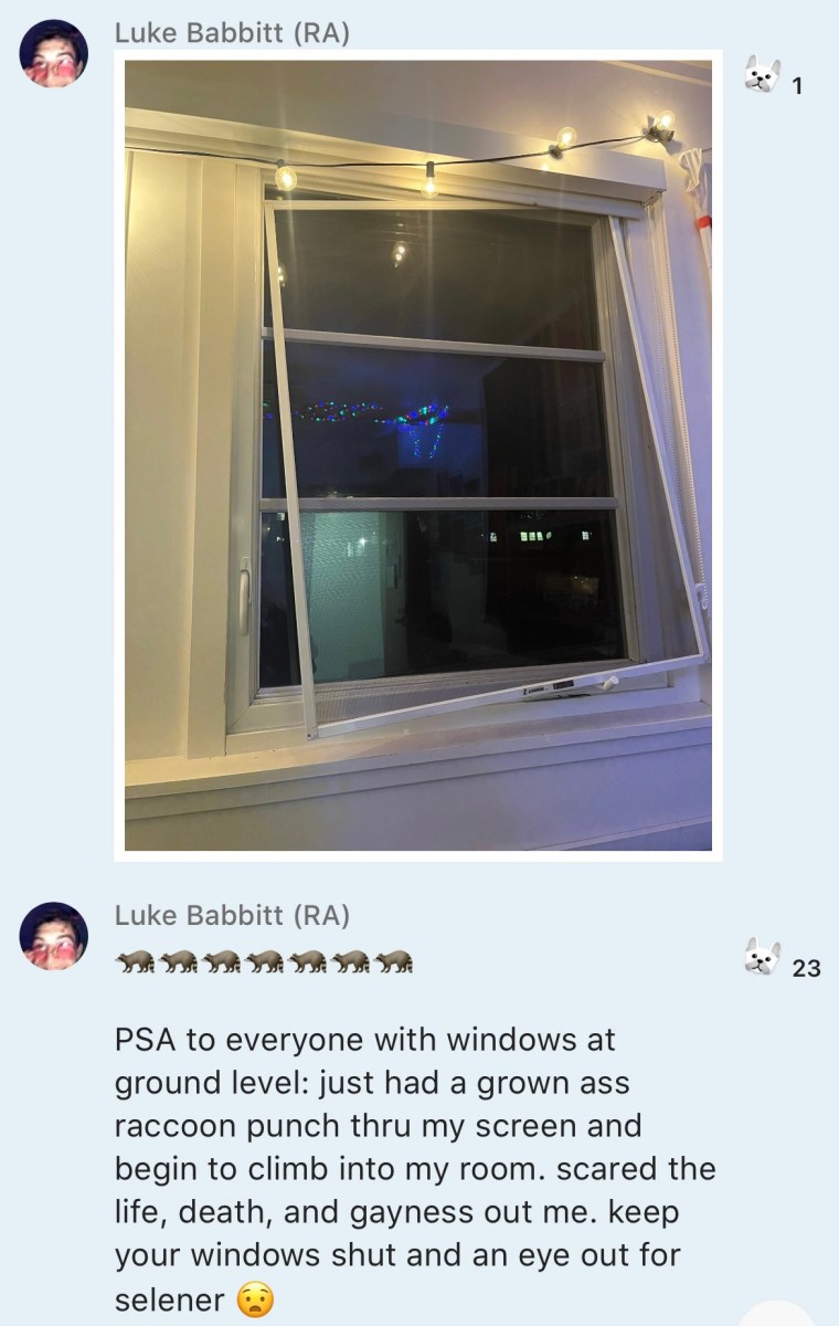 Unfortunately for Luke Babbitt ’23, one such raccoon trespassed into his dorm room. On Jan. 30, as he lay in bed with the windows open, he heard a menacing cracking sound. The window screen popped off the frame and a raccoon paw came in, pulling a crawling creature through the crevice. Panicking, Babbitt started making his escape, but then decided to defend his home turf, going from “a moment of flight to a moment of fight.” Swinging his pillow at the window, he managed to shoo away the invader. Reflecting on the surreal encounter, Babbitt said the interloping raccoon “scared the life, death and gayness out of [him].”