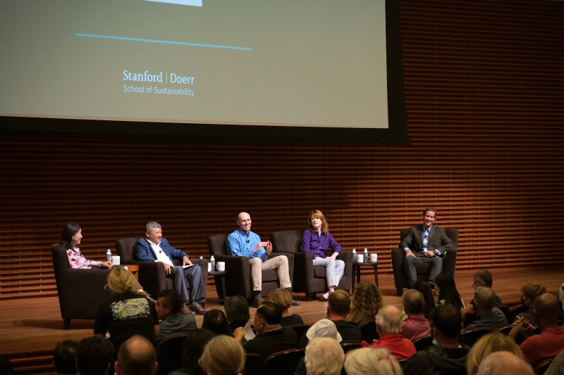 Members of the Doerr School of Sustainability fireside chat speak to alumni on Friday. (Photo: RACHEL CODY OWENS/The Stanford Daily)