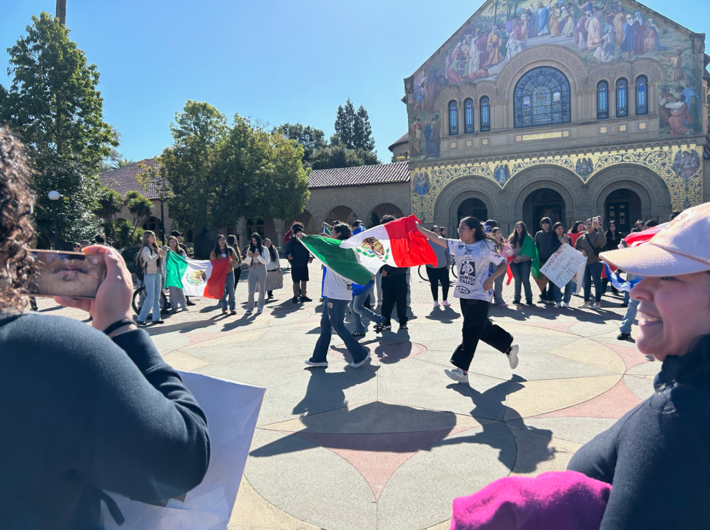 Student protesters from East Palo Alto’s Eastside College Preparatory Academy converged in Main Quad with community members around noon Wednesday to denounce the ongoing crackdown on immigration under President Donald Trump. Carrying the flags of Mexico and El Salvador while playing music in Spanish, the protesters chanted phrases like “vivan los inmigrantes” and “sí se puede.”