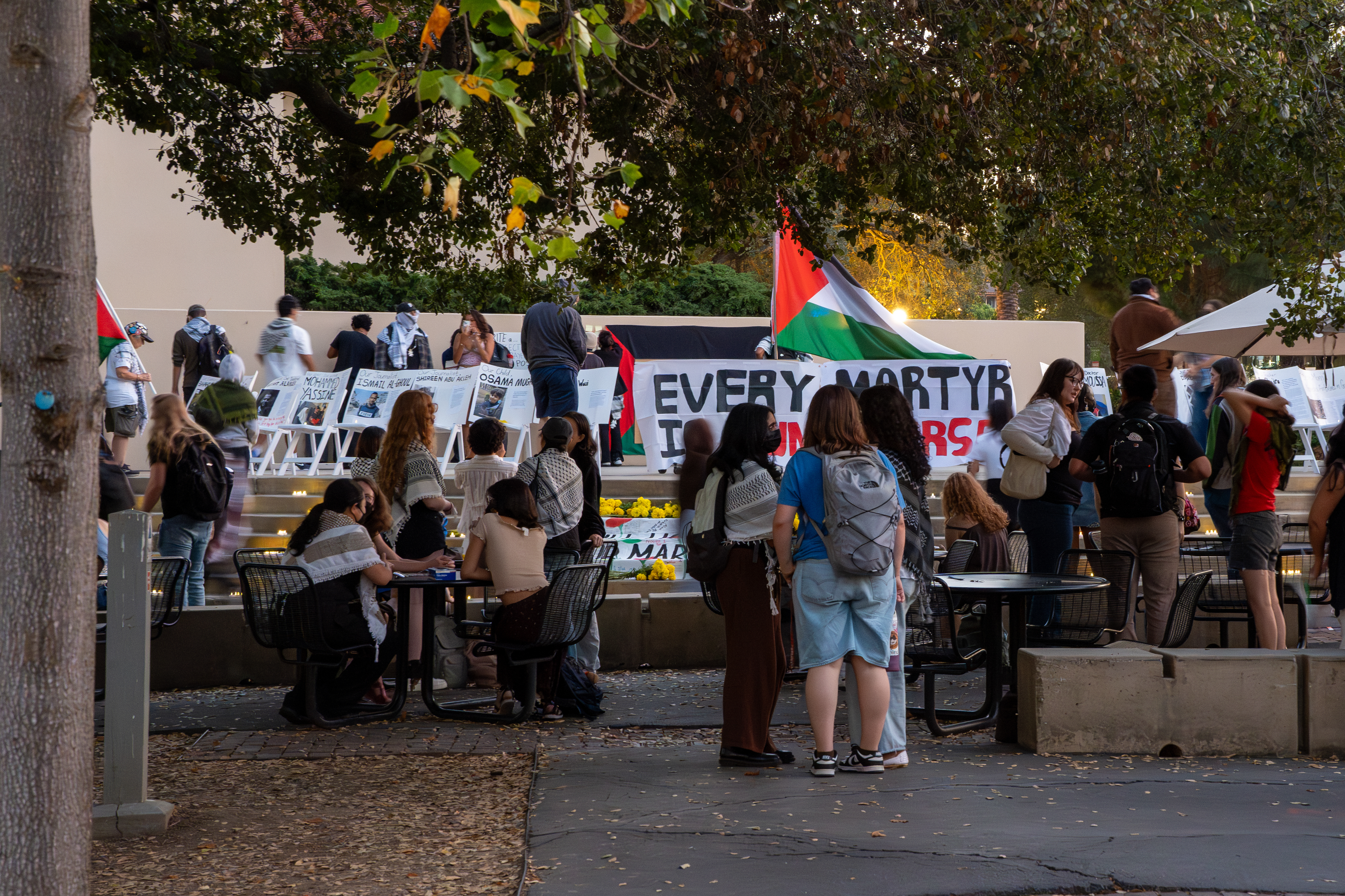 Organizers added candles and flowers on the steps in front of the posters before the vigil started. The largest sign at the center of the stage read “Every Martyr is a Universe” with a Palestinian flag waving above it. On the ground near the stage another sign read “Divest Now, #SITWITHUS #DIVESTSTANFORD.”