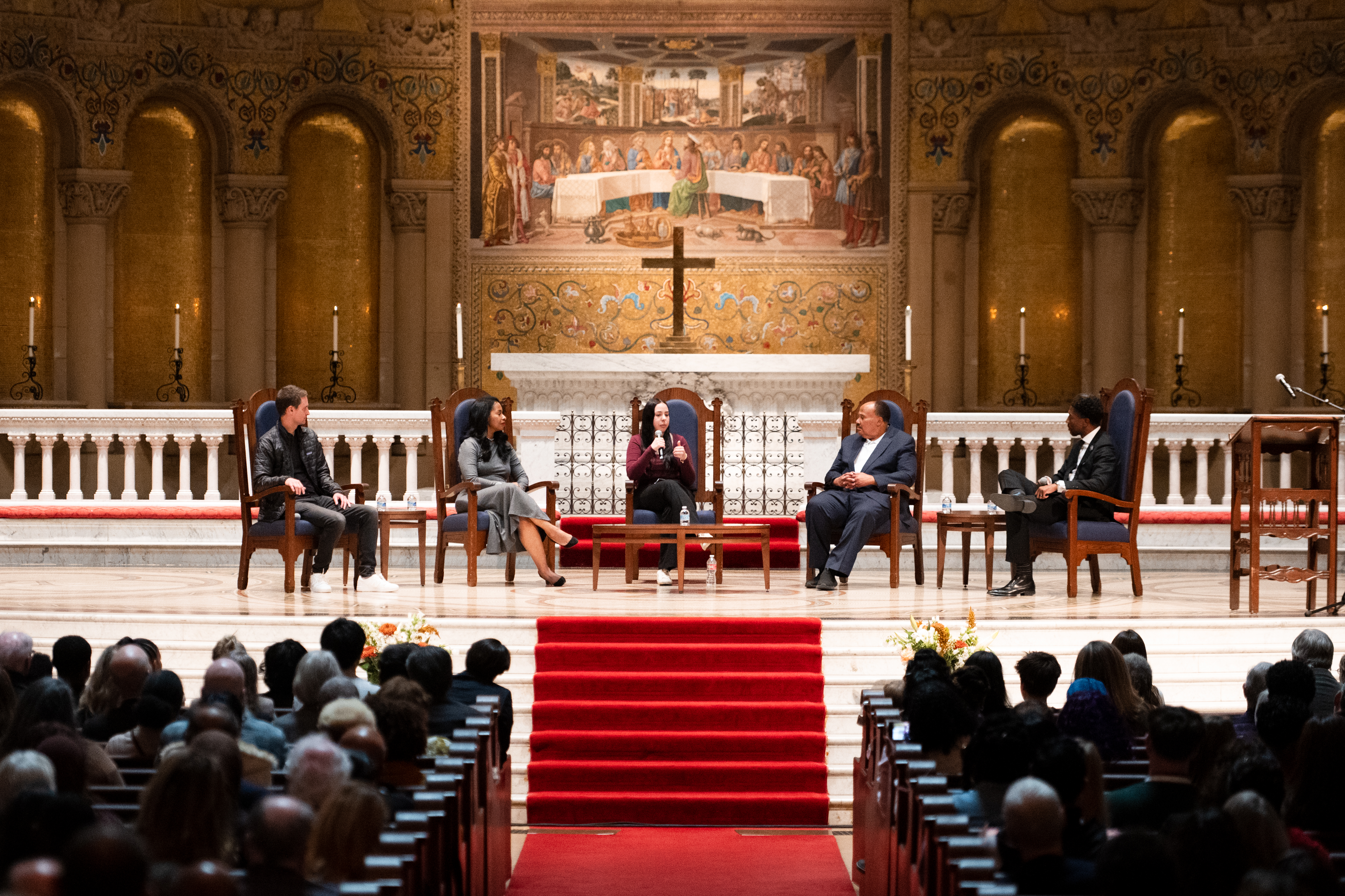 The beginning of the event, held in Memorial Church, featured a panel discussion with Institute director Lerone A. Martin, alongside Martin Luther King III, Arndrea Waters King, president of the Drum Major Institute, Marina Limon ’25 and Evan Spiegel, Snapchat co-founder and Institute donor. Together, the panelists reflected on King’s enduring influence, the new institute’s educational mission and the ways in which space, history and activism intersect at Stanford and beyond.
