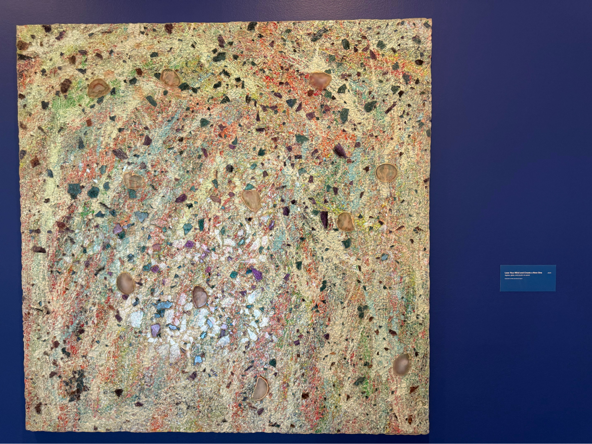 Since September 2025, visitors to the Anderson Collection have been greeted by jagged turquoise, violet and sepia, interspersed with bright coral and lime-green flecks. Drawing closer, visitors see these fragments shimmer and shift, flooding the gallery with color through the entrance’s wide glass windows. The painting’s title, “Lose Your Mind and Create a New One,” is at once a premonition and an invitation, encouraging viewers to loosen the confines of their perception.