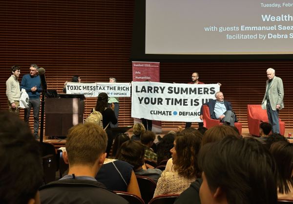 Protestors storm the stage during lecture with former Secretary of the Treasury