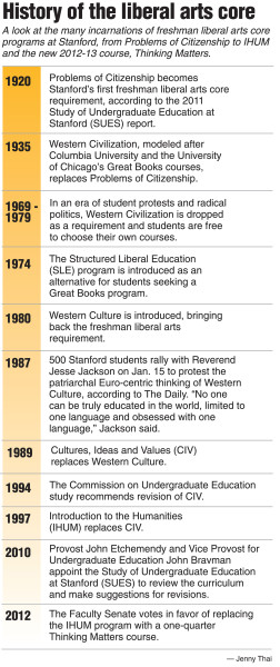 The Faculty Senate closed the book on the Introduction to the Humanities (IHUM) program by voting on March 8 in favor of replacing the program with a one-quarter “Thinking Matters” course, scheduled to launch this coming fall. Although IHUM was a quintessential fixture of the Stanford experience for recent students, it was only the latest edition in Stanford’s history of freshman liberal arts programs, an undergraduate tradition that is nearly 90 years old.