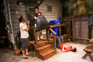 Bill English’s set is beautifully detailed and creates a backyard hangout, with a picnic bench center stage, garbage bins on the right and a building at the back, complete with a porch, a screen door and even a hot water heater on the building’s side. Since the space is small, every aspect is up for scrutiny, and the intimate space puts us right in the backyard with the characters. Michael Palumbo’s lighting is equally effective, effortlessly alerting us to the time of day, whether it’s the warm July sun or the cool summer moonlight.