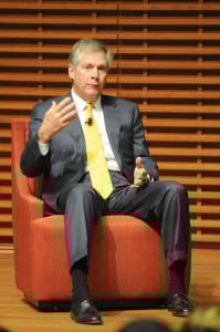The presentation took the format of a “fireside chat,” with questions posed to Oberhelman by a GSB student. When asked what the company’s three most pressing challenges are, Oberhelman answered accountability, a connection with customers and asset allocation.