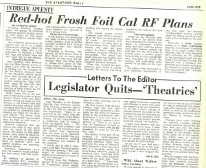 Referred to in the 1965 article as the “head of the Stanford special police force,” the young Romney apparently returned to Stanford with some vital intelligence before hitting the beat himself, guarding the Axe and the Lake Lagunita bonfire leading up to the Big Game.