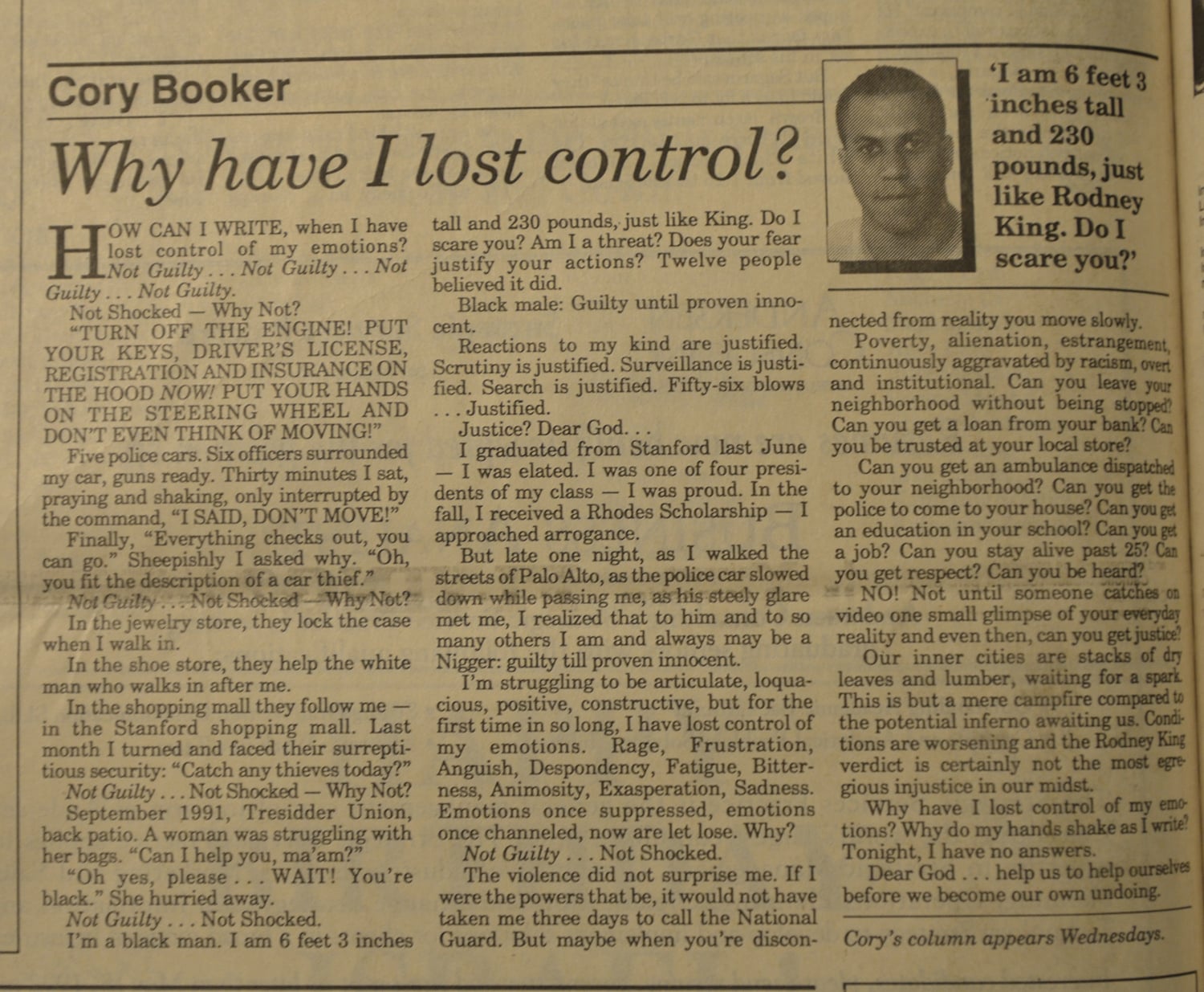 This article was published in Volume 201, Number 52 of The Stanford Daily on Wednesday, May 6, 1992, shortly after the controversial Rodney King verdict.