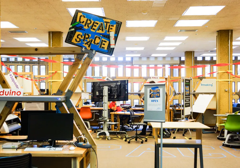 This space is meant to be a place for creative activity and features components of digital creation, like multimedia-equipped computers, scanners and the 3D printer.