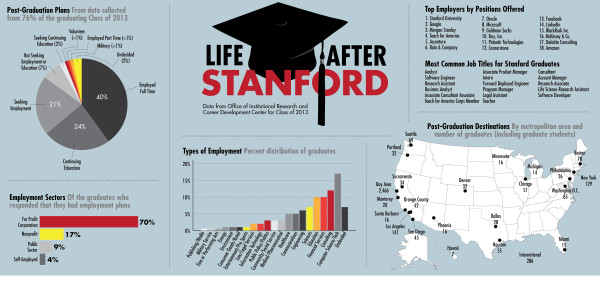 As the Class of 2014 prepares to leave Stanford, many wonder where they will be headed next. Based on the data from the class of 2013, the Career Development Center (CDC) projects that 40 percent of the Class of 2014 will head into full-time employment, 24 percent will continue on into graduate or professional school and 21 percent will still be seeking employment.