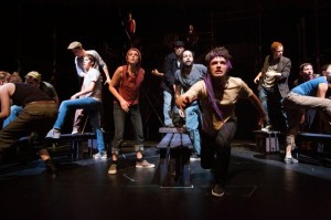The chapel scene from the novel is recreated by turning over the benches into pews and a pulpit. The actors sing a lovely hymn, their voices blending harmoniously together. A preacher (Courtney Walsh) expounds on the biblical story of Jonah and the whale, declaring that one should cling to God despite adversity, a theme that will reappear later on as Ahab repeatedly declares that no force can stop him from his pursuit of Moby Dick. Ishmael then encounters a crazy sailor named Elijah (Dante Belletti), who warns him against joining Ahab’s crew because of the treacherous life that whalers lead. Elijah sports a black hoodie that seems like normal streetwear but for the white skull graphic on the back, which augurs the ocean’s perils. This is just one of the many thoughtful details in costuming that relates each supposedly modern-day character to his or her character in the novel; for instance, Captain Ahab’s first mate, Starbuck (Peter Ruocco), appears to be holding a Starbucks drink at the start of the play.
