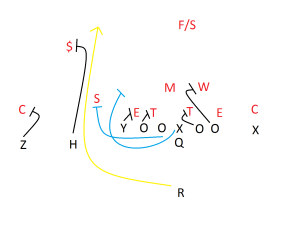 To open the drive, Stanford called a pin-and-pull outside zone. Unlike standard outside zone, where the offensive linemen try to open holes between and just off the tackles, the pin-and-pull is designed to get speed in space as soon as possible. This is accomplished by directing any offensive linemen without opponents directly across them on the line of scrimmage to pull to the outside (paths in blue) and block whatever comes their way. Meanwhile, any “covered” offensive linemen and tight end Austin Hooper (Y) would block “down” (away from the play).
