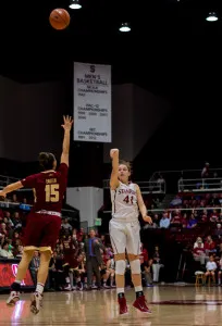 Hot shooting from guard Bonnie Samuelson kept the game within reach at the end as her three triples and 11 points (of her total 14) in the second half rallied the Cardinal offense.