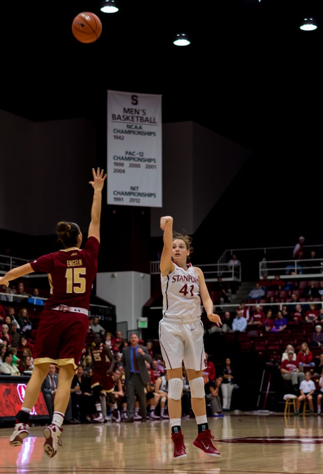 This season, the senior guard/forward has earned her way into the starting lineup for the past five games, shooting 40 percent from behind the arc and averaging 7.7 points per game. Just as she knocked down clutch shots against Washington last year, Samuelson has come through when needed, such as against Colorado in the Pac-12 opener last weekend to end a Cardinal scoring drought and help the team pull away from the Buffs.