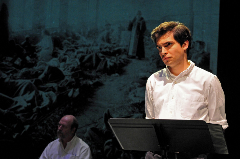 The piece is a series of vignettes borrowing from several texts, including first-person accounts of the war to poems and novels written about the war, artfully compiled into an evening of theatre. For each vignette, a short biography of author who wrote the text and photographs from the war are displayed on a projection screen, consistently and effectively reminding us of the history that is being brought to life by the actors. The performance in front of the screen is a simple, script-in-hand reading, with no set pieces and uniform costumes consisting of white shirts and black pants or skirts, directing our attention toward the text