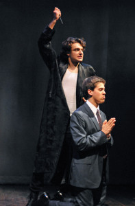 Andre Walker Amarotico ‘16 showed complexity and verve as the tortured Hamlet, oscillating between Hamlet’s extreme emotions and moods with ease. He could be acerbic and arrogant, but he showed great emotional range in portraying Hamlet’s inner conflict. Believing he had seen the Ghost of his late father (Ian Anstee ‘18), Hamlet battled suicidal desires while feeling viciously angry and revengeful toward his uncle Claudius (Louis McWilliams ‘16), whom he suspected of killing his father, the former king, so that he could marry Hamlet’s mother, Gertrude (Kiki Bagger ‘15).