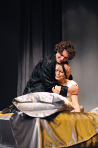 The little details settled in the heart of the viewer. When Amarotico delivered the famous “to be or not to be” speech, questioning whether he should still be alive, he slowly ran a blade along his arm, a small action that heightened the tension of his dilemma. The actors had a great sense of pacing and spacing, and the fight scenes were raw and intense. In fact, the visceral struggle between Hamlet and the beautiful, troubled Ophelia (versatile actor Jessica Waldman ‘15), for whom Hamlet fights his own romantic feelings, was laid bare, in one way, by the fact that Waldman skinned her knee and drew blood.
