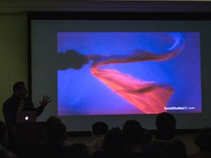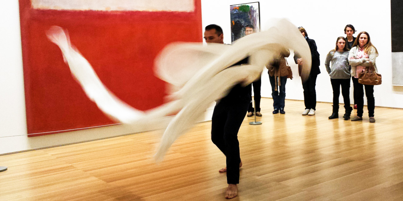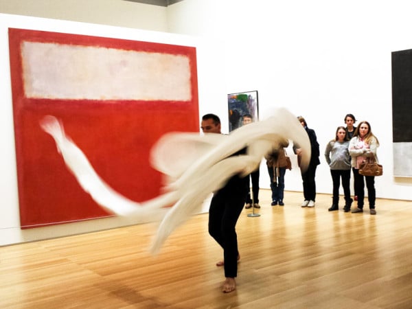 Twist concluded his presentation by giving a live performance of his puppeteering. With Rothko’s “Pink and White over Red” as his backdrop, Twist commanded the floor, armed with a translucent white expanse of silk cloth. Puppeteering is an art form that engages the entire body, as Twist quickly made apparent. Breathing heavily, Twist coaxed the material to form mesmerizing loops and spirals with powerful swings of his arms. At the end of his demonstration, Twist beckoned the crowd to give the cloth a standing ovation, placing the focus back onto his inanimate performer.