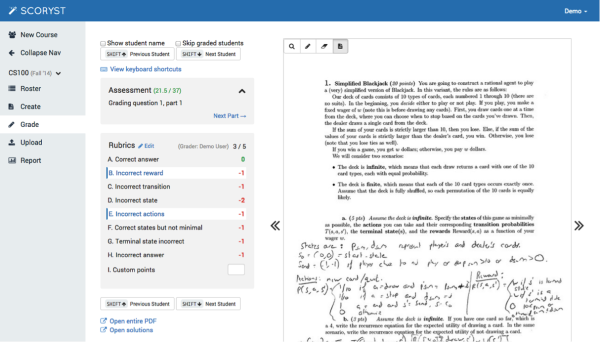 As former section leaders for the CS106 series, they understand the problems teachers and teaching assistants face when they need to receive and grade homework. All of the problem sets and assignments can be submitted online via Scoryst, where teachers and their assistants can easily edit grades, comment on assignments and navigate quickly through questions. In this way, the grading process becomes more efficient and can be done completely online.