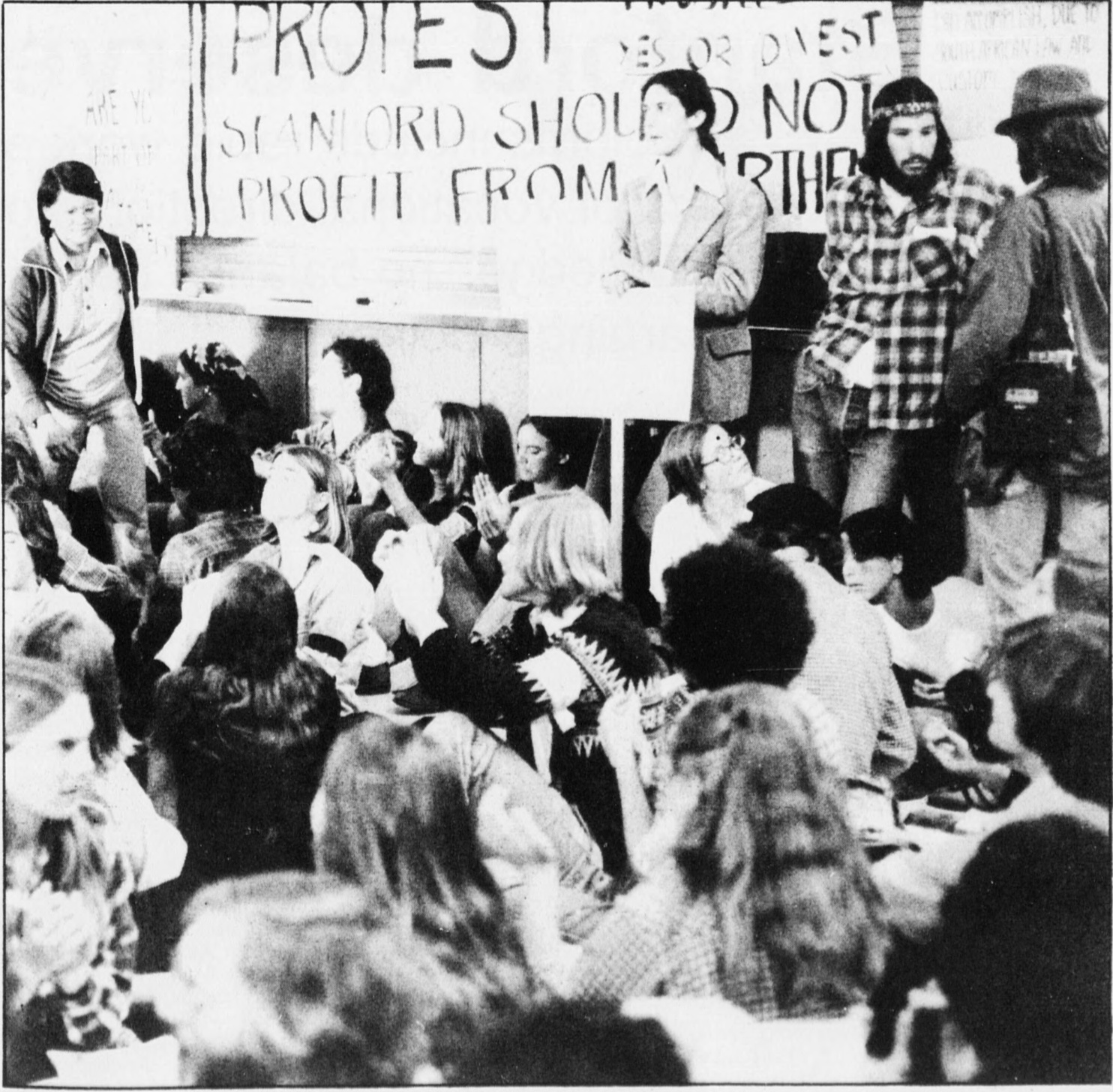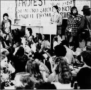 On May 9, 1977, over 500 students participated in a sit-in at Old Union demanding that Stanford divest from apartheid South Africa.