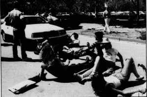 Protest over apartheid divestment renewed in May 1985 after the Board of Trustees said it would not fully divest from companies that invested in South Africa. Board members emerged from a morning meeting to find approximately 35 students laying down around their cars in protest, singing.