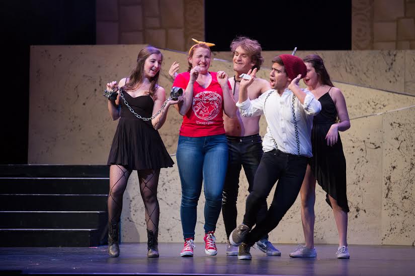 The show, set against a nice backdrop reminiscent of the Main Quad, begins with a group of sassy metallic-toga-clad “Rodin sculptures” that speak with French accents and serve as a sort of Greek chorus throughout the production. The audience is quickly introduced to the requisite Cal enemies — a mad scientist (Kyle Robinson ‘18) who Stanford expelled back in the day and her sidekick, a delightfully diabolical, goonish Grubbers (Phoebe Oathout ‘18). They are painfully jealous that “Stanford students actually live in a constant state of nirvana.” Their plan? Infect Stanford’s population with a love virus so that no one can focus on their work. This serves as clever commentary on the state of love life at Stanford — the protagonists are distressed because Stanford cannot possibly go on if people actually date each other!