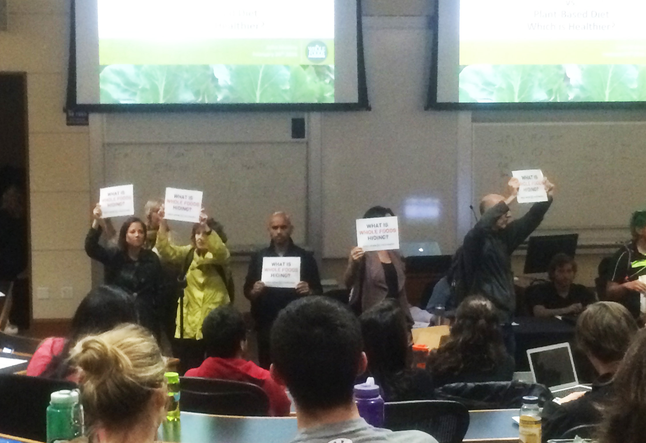 Soon after the first protester was removed, another group of eight protesters from Direct Action Everywhere, rose from their seats, chanting and walking to the front of the room. The protesters carried signs reading “What is Whole Foods hiding?” and progressed through a variety of chants.