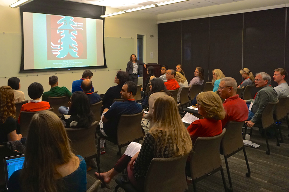After introductions, law professor Michele Dauber gave a presentation that began with a discussion of the current sanctioning process for students found guilty of sexual assault. She feels the sanctions are not harsh enough and that this might discourage students from reporting assaults. Low sanctions also might not deter students enough from actually committing violence, she said.