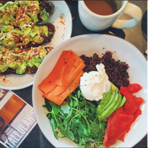 Smoked salmon, poached egg, and quinoa breakfast bowl