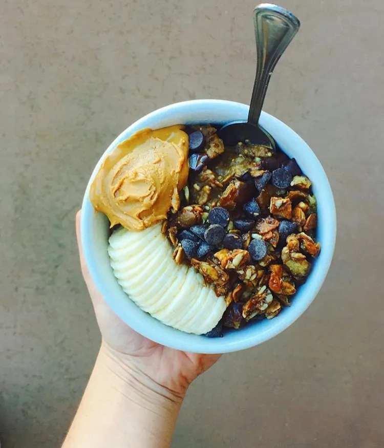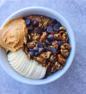 Top with whatever toppings your heart desires — fruit, granola or nut butter. I’m a fan of banana, (a lot of) peanut butter, grain free granola and dark chocolate chips (because why not!).