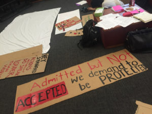 The students remained for roughly an hour through a series of administrators’ speeches, staying silent during the talks but chanting during intermissions and taking up a mantra of their own when Dean of Admission and Financial Aid Richard Shaw tried to lead admits in a chant.