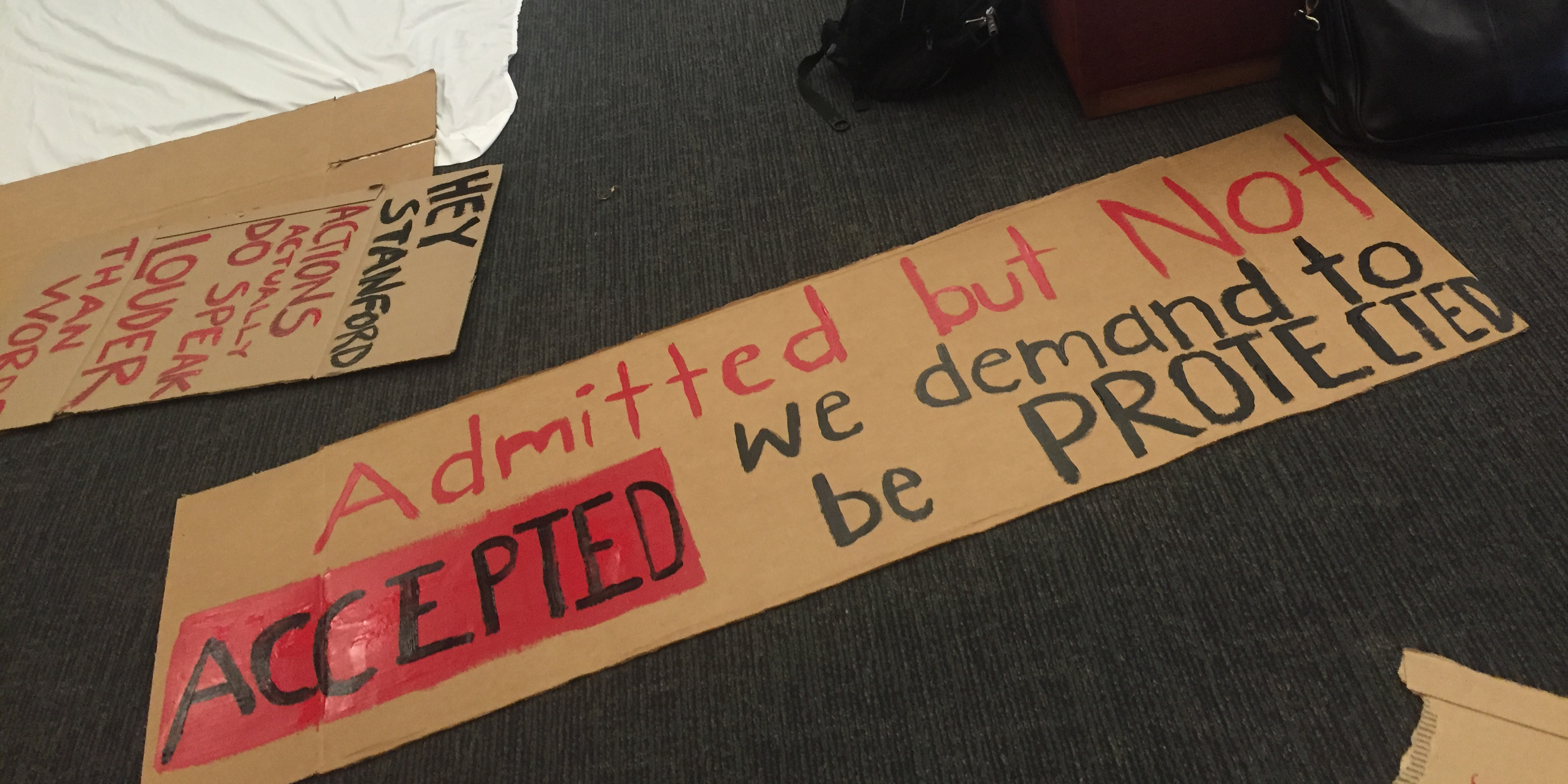 About a dozen students from Stanford Sanctuary Now (SSN), Students for the Liberation of All People (SLAP), MEChA de Stanford and the Stanford Student and Labor Alliance (SALA) stepped onstage bearing cardboard signs as Provost Persis Drell addressed prospective freshmen (ProFros) and their families.