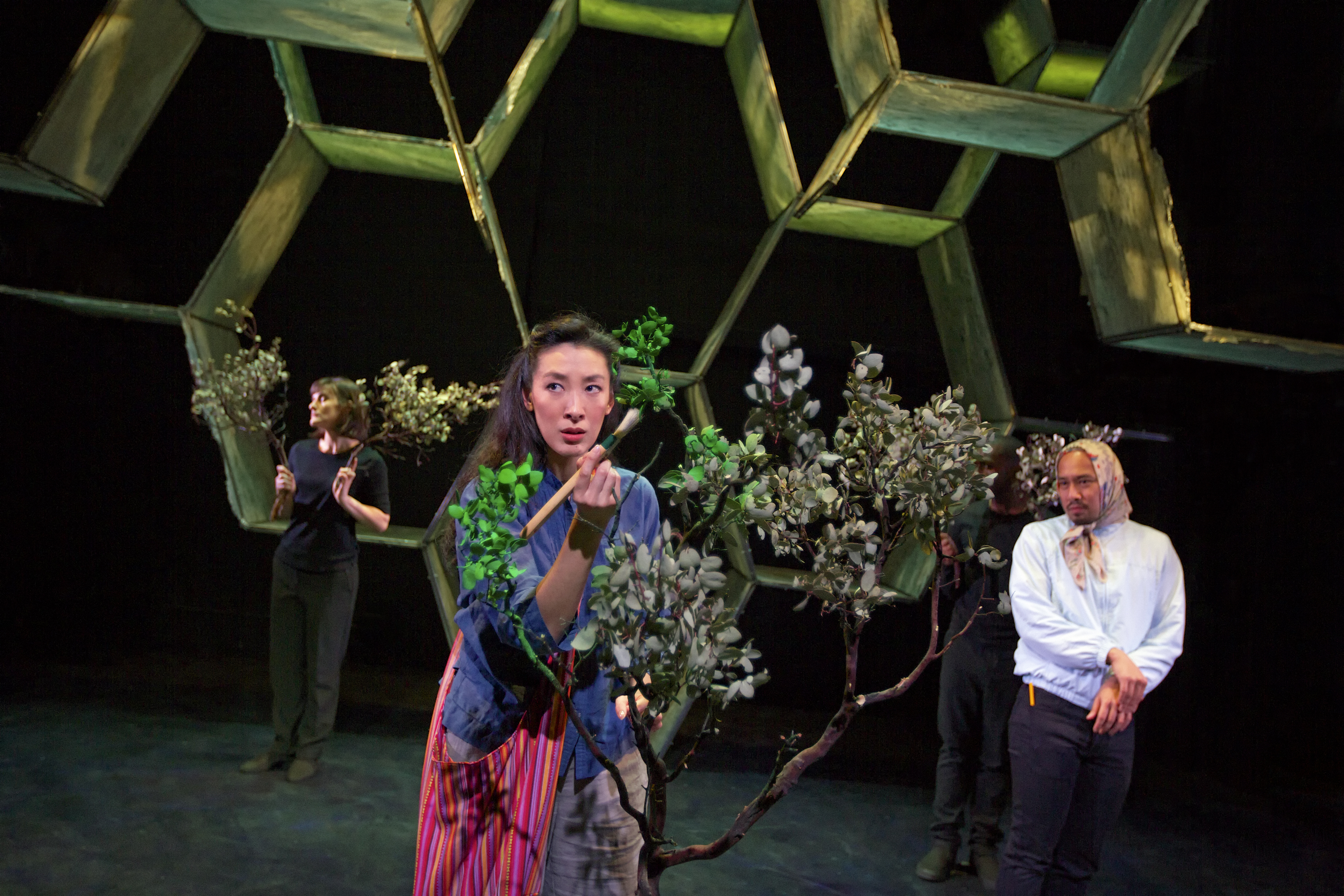 Mia Chung’s “You for Me for You” tells the story of two North Korean sisters, Junhee (Grace Ng) and Minhee (Kathryn Han), and their lives after Junhee successfully escapes to the United States while Minhee is left behind. As soon as I walked into the theater, a large honeycomb structure hung from the ceiling as the set, the rest of the stage black, stark and bare. Lights glistened off the honeycomb-like pieces, remaining empty but filling the space with a sense of rigidity, order and forced conformity, not unlike the North Korean state in which Junhee and Minhee live.