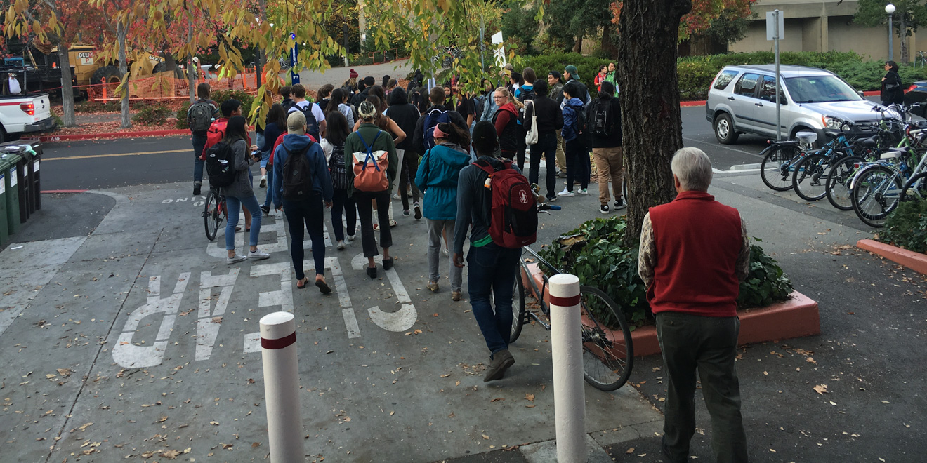 The students convened in the courtyard outside of Serra house in Stern Hall and walked down Galvez Mall to President Marc Tessier-Lavigne’s office in the Main Quad, where they presented letters of discontent to administrators.