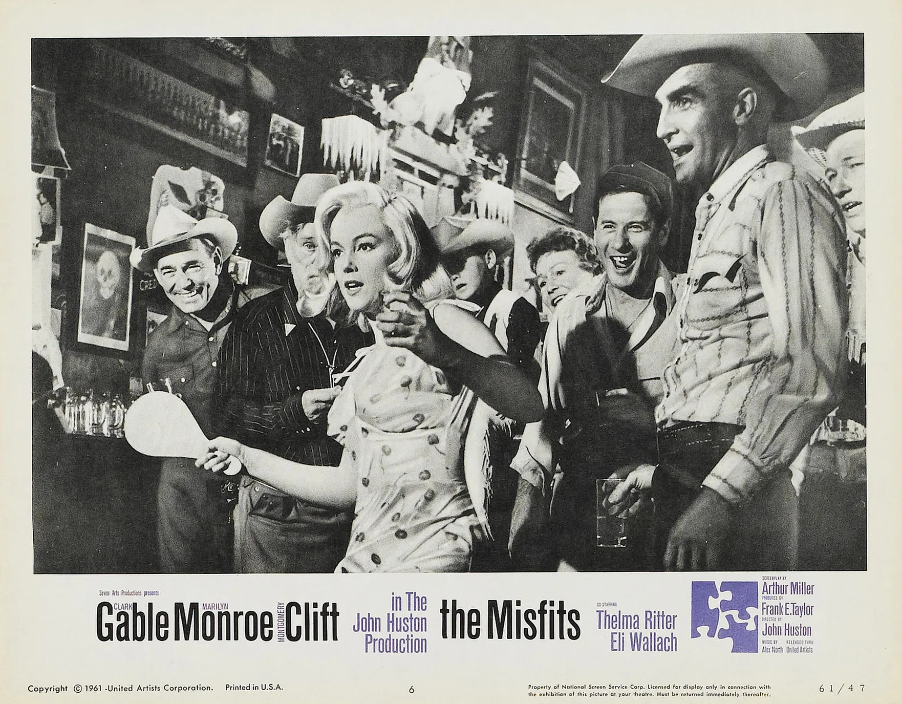 Monroe is Roslyn Taber, an ex-stripper filing for divorce, who ends up in Reno, Nevada with four equally lost sad-sacks at the end of their ropes: the aging cowboy Gay Langland (Clark Gable, in his final film role); former World War II flying ace Guido Racanelli (Eli Wallach, “The Good, the Bad & the Ugly”); a has-been rodeo rider (Montgomery Clift, who soon died after filming from a lifetime of alcohol and drug addiction); and a lonely divorcee, Roslyn’s only friend (Thelma Ritter of “Rear Window” fame). They all strike up a business capturing wild horses.