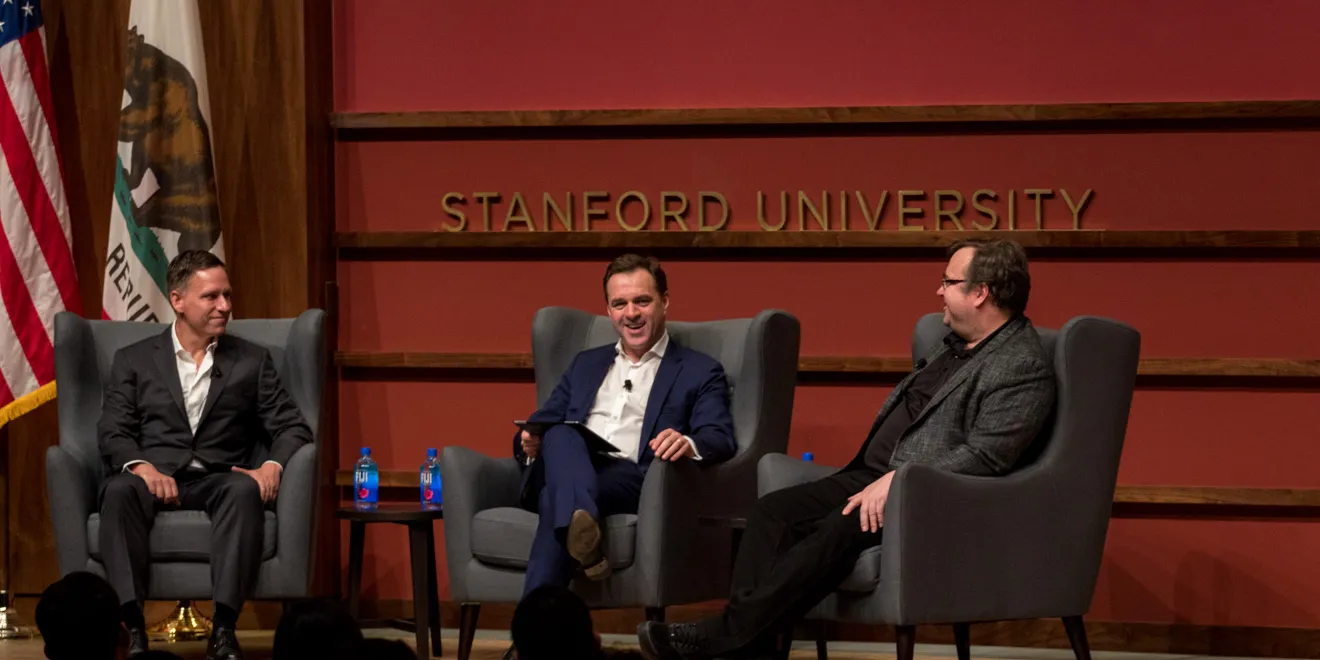 The conversation wrapped up as Ferguson asked Thiel and Hoffman whether they think they would still be friends today if they hadn’t met at Stanford. Hoffman answered yes, and Thiel — though he said he can’t answer “such an insane counterfactual question” — acknowledged the value in hearing the other side’s argument and said Stanford is a unique opportunity to do so.