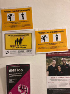 On Jan. 20, another ICE hotline poster was torn from the resident’s door. In response to this act, three students – Jessica Reynoso ’20, Mayahuel Victoria Ramírez ’20 and Araceli Alicia Garcia ’20 – printed over 200 more of the yellow ICE hotline posters with the support of Stanford’s branch of Chicanx Student Movement of Aztlán (MEChA). They proceeded to post flyers all over the foyer and in many of the hallways of Kimball.