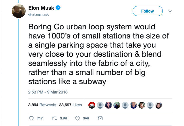“[Thousands] of small stations the size of a single parking space that take you very close to your destination [and] blend seamlessly into the fabric of a city,” Musk gushed on Twitter.