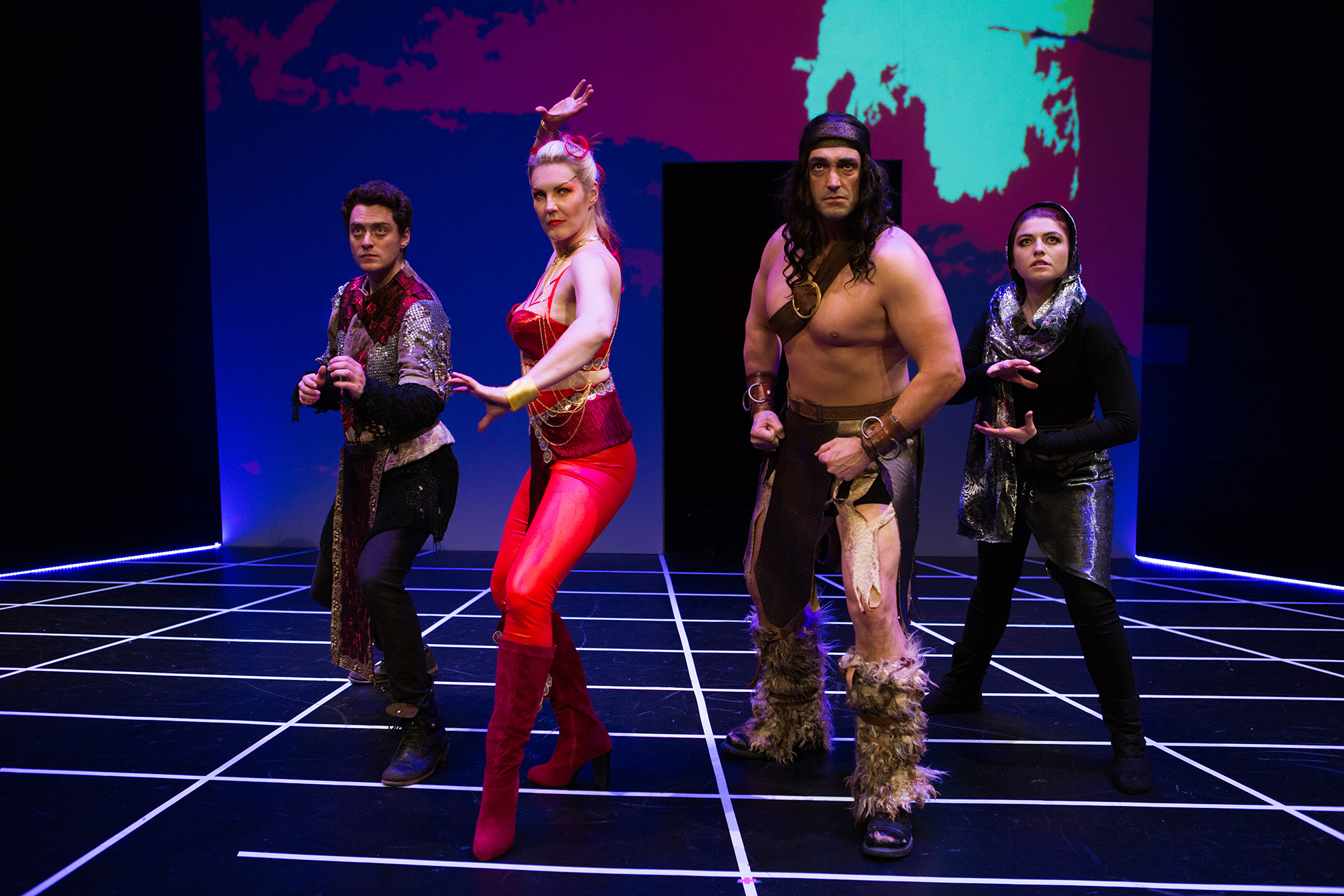Theater is an interesting medium. Often, characters have to transcend space and “play out” to the audience rather than speaking face to face to each other because of sight lines and simply being able to have the audience seeing the actors. Because of the digital space in which the characters interacted for much of the show (Katja and Trent playing the online game), this was able to be represented by the actors prancing and moving around the space as their avatars, shooting space-object weapons and swinging imaginary swords, accompanied by heavily captivating sound effects (designed by Theodore J.H. Hulsker). These interactions were so compelling (with choreography by Elena Wright) that there wasn’t even a need for real objects or set pieces in space, which aided the production extremely well.