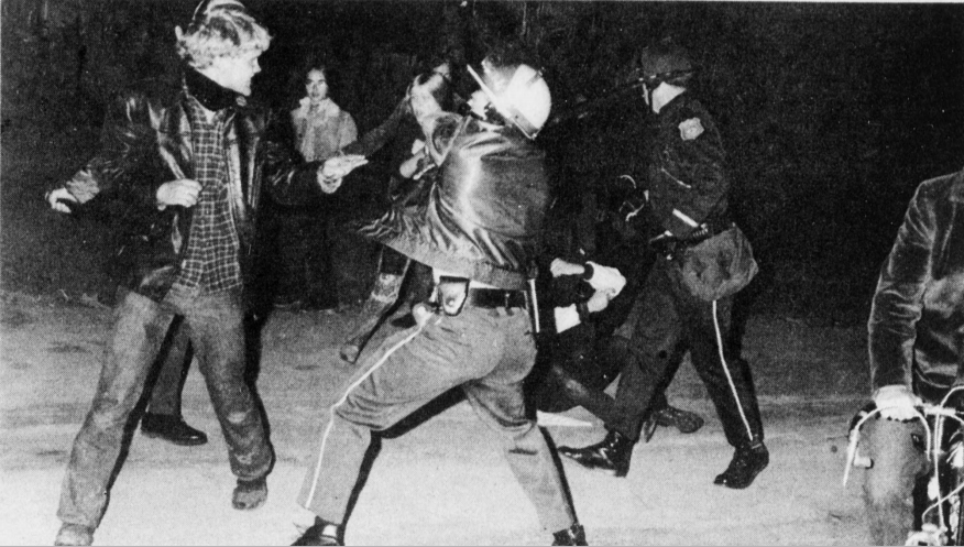 Indeed, free speech at Stanford in the Vietnam-era was sometimes marked by violence. In 1966, an English teaching assistant was beaten up while distributing leaflets against napalm. In 1972, when a crowd of seven hundred anti-war activists led by Siegel marched down Palm Drive carrying torches, police officers charged the crowd. Several students were admitted to the hospital for their resulting injuries.
