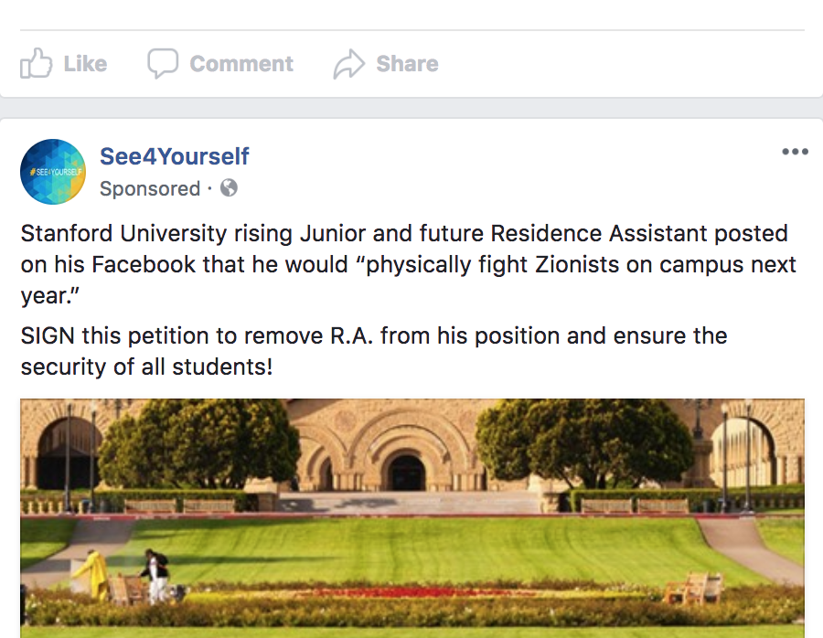 Two of the ads led to the same Change.org petition, started on Tuesday by a user named NYC4IL, which is also the name of a pro-Israel organization based in New York City. The public NYC4IL Twitter account also posted the petition. The petition to “Fire Stanford RA on Basis of Explicit Threats, Hate Speech, to Ensure Dorms are Safe Space” had received over 300 signatures as of Thursday night.