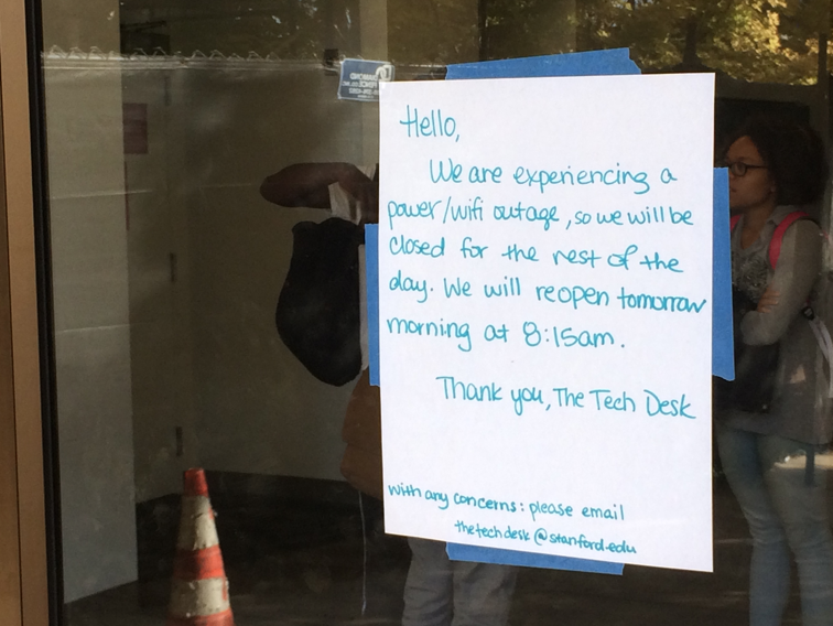 WiFi connections were also impacted, as the Stanford network rendered temporarily unavailable for an unknown number of students. Staff of the Lathrop Tech Desk described the incident as a “power/wifi outage” in a sign posted on the door of the Lathrop Learning Hub.