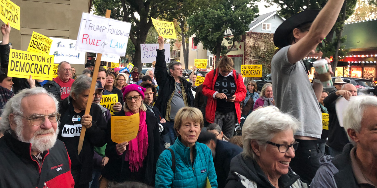 The protest — which moved from the office of Representative Anna Eshoo (D-CA 18) to King Plaza — was organized by left-wing advocacy group MoveOn and “Nobody Is Above the Law,” a national network created to defend the integrity of special counsel Robert Mueller’s ongoing investigation of Russian meddling in the 2016 presidential election.