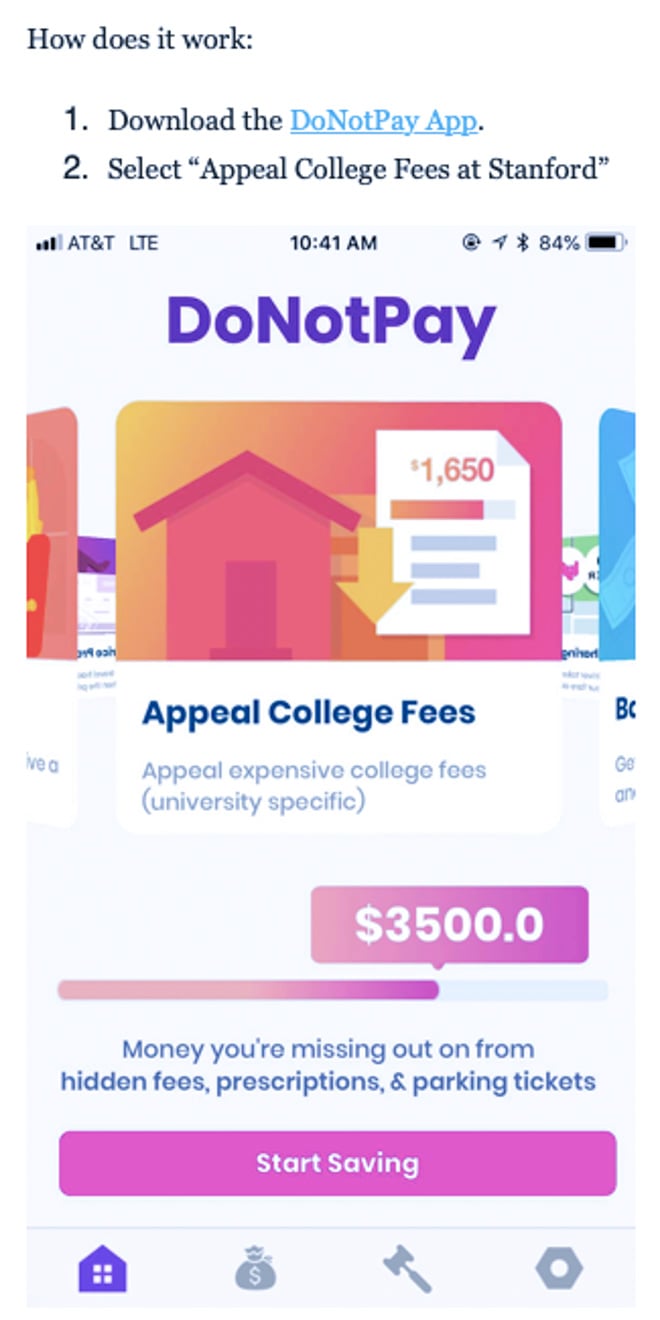 The email, said to be from from “the office of John Adams,” told recipients that “Stanford charges you hundreds of dollars in unnecessary fees” every quarter. It also offered recipients the opportunity to “get this money back” using DoNotPay’s service.