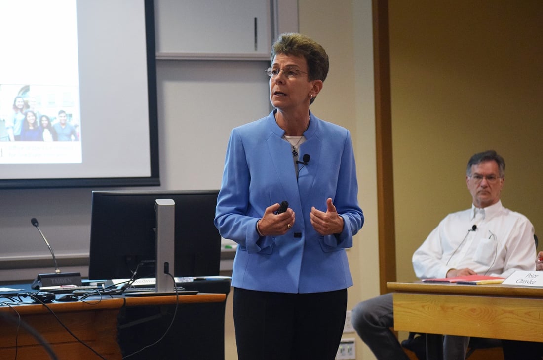 Gumport began by describing her previous 13 years working to develop graduate program policies as a “source of joy.” Looking back on a study published in 2004, Gumport reminded the audience what overarching goals she and fellow faculty had set for graduate education then that still remain true today.